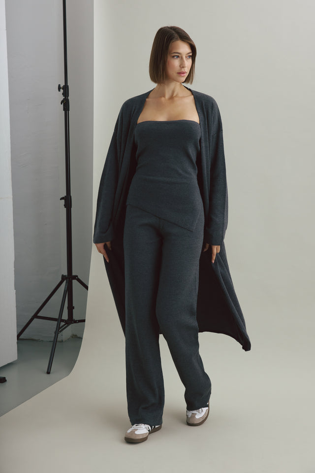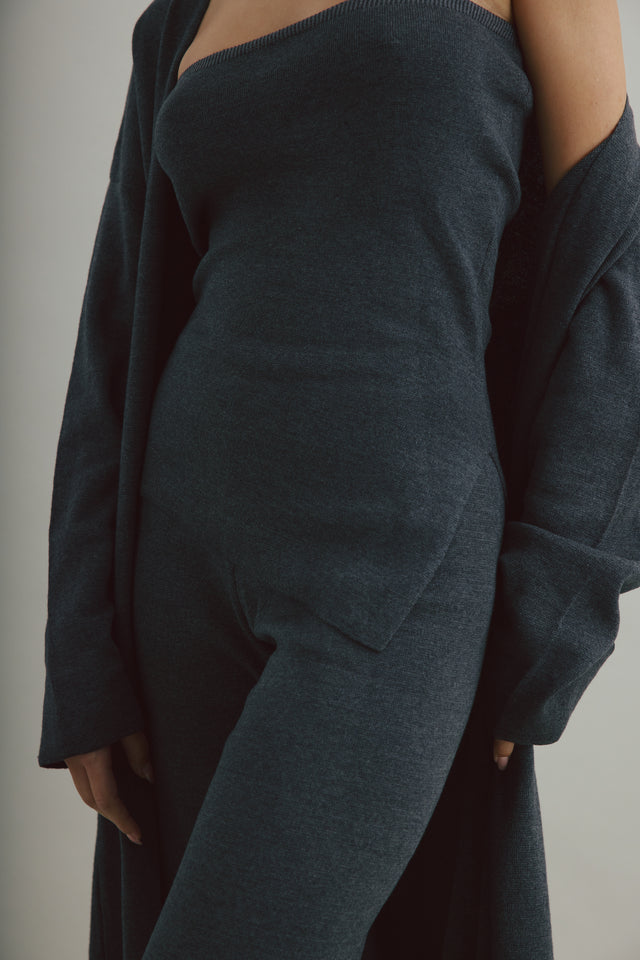 Set FAYE in edlem Grau verkörpert pure Effortlessness: ein asymmetrisches, trägerloses Top, das sanft die Schultern betont, ein fließender Cardigan mit offener Silhouette und eine gerade geschnittene Hose, die Komfort und Stil perfekt vereint.