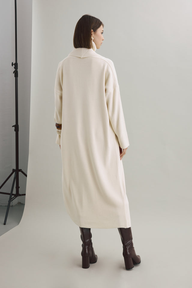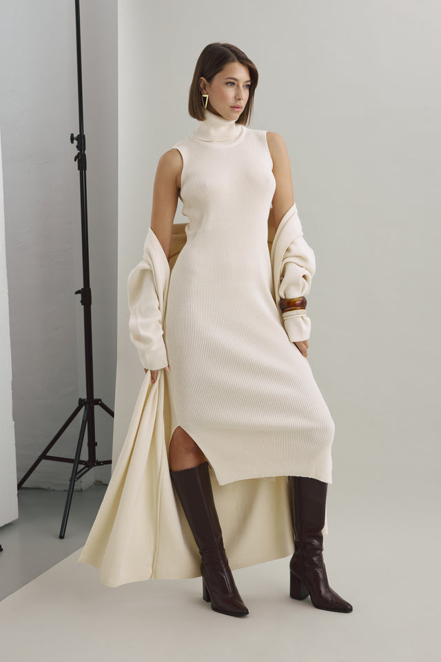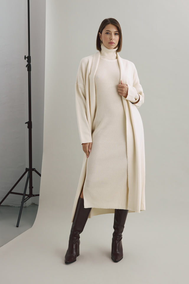 Set Orielle verkörpert pure zeitlose Klasse: Ein figurbetontes Maxi-Rollkragenkleid aus softem, elastischem Strick, kombiniert mit einem langen, fließenden Cardigan, der jede Bewegung sanft umspielt.